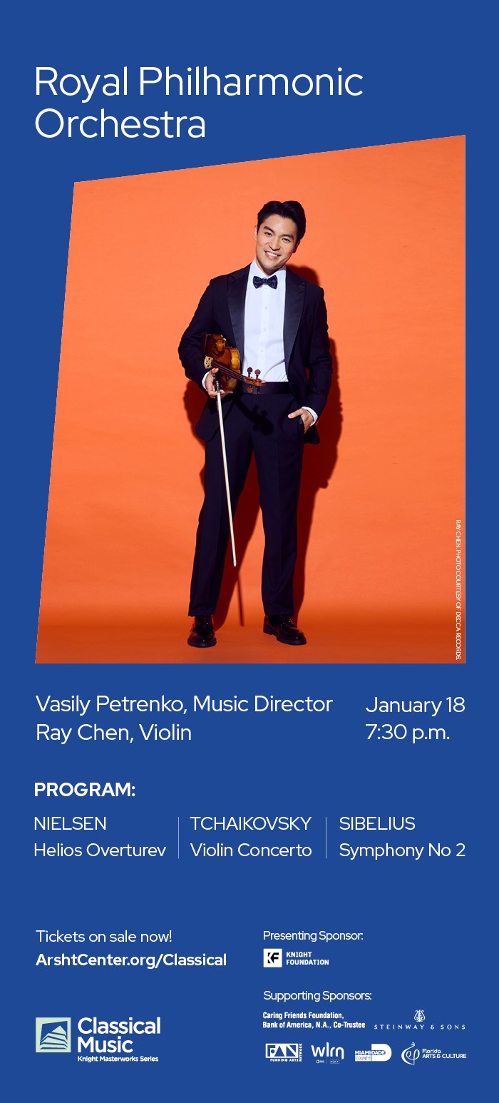Joining them on the first half of the program is the enormously popular Ray Chen, who is known to play a “virtuoso lick with a rock ’n’ roll stance, making it look mighty cool to be a violinist” (Violinist.com). He’s sure to be the coolest dude in the room when he takes on Tchaikovsky’s sweeping, melodious and virtuosic Violin Concerto, an undisputed crown jewel of the repertory. But first, the evening opens with Carl Nielsen’s life-affirming Helios Overture, the Danish composer’s radiant evocation of the sun god and his chariot journeying across the sky.",